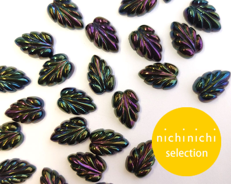 ns348/ヴィンテージ/ガラスカボション/ブラックオーロラリーフ(1個)