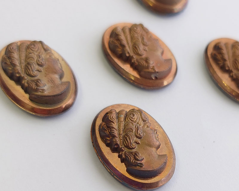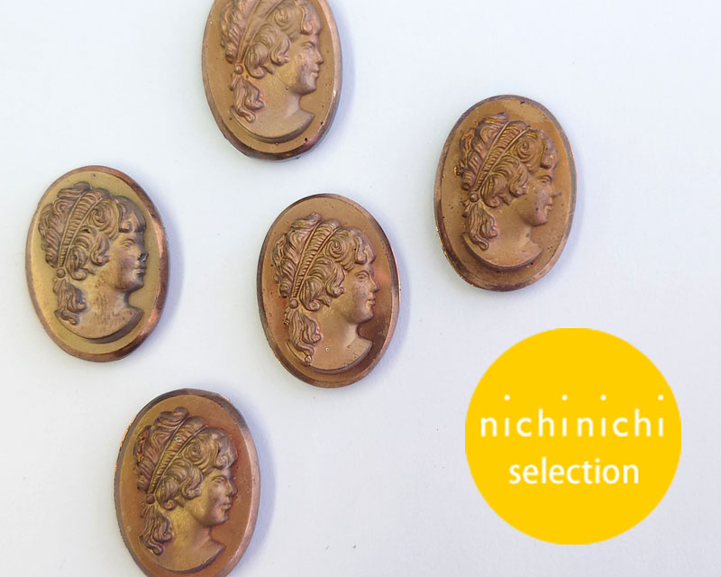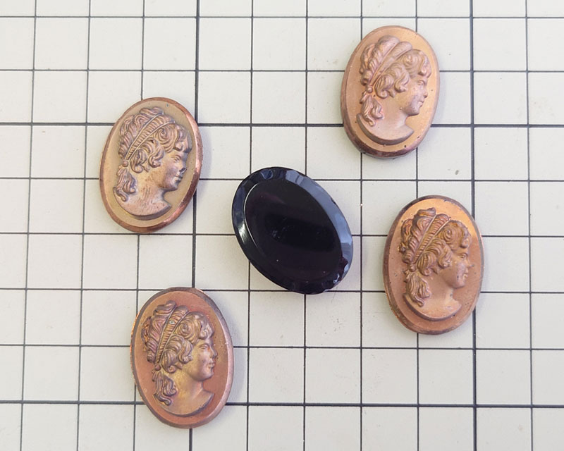 黒いガラスにブロンズ加工が施されたカメオです。