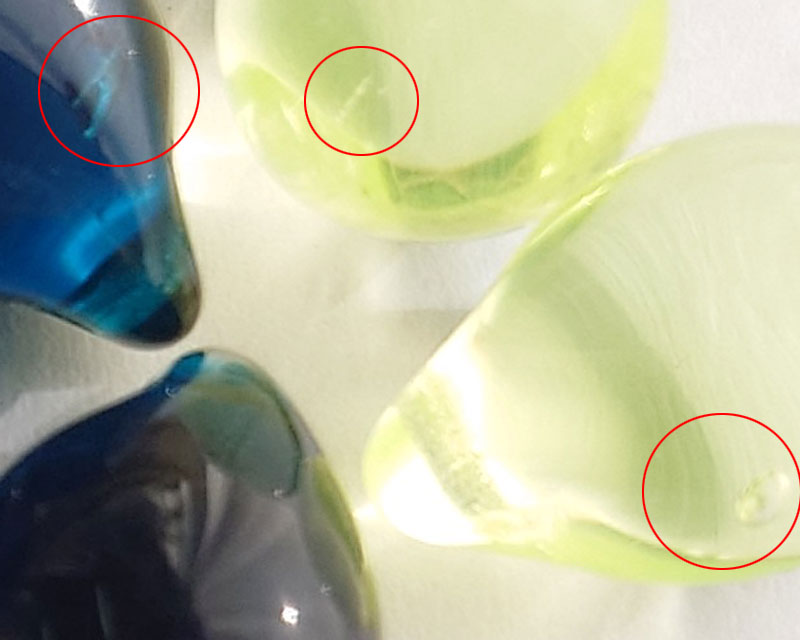 3枚目、4枚目画像のような大きな気泡・内部のクラック・3mm以上の皺があるものは弾いています。